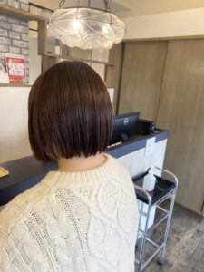 ショートの様にレイヤー(段差)を付けるのではなく、全体の長さが揃うまで伸ばしながら毛先にぱつっとラインを残したショートボブ。