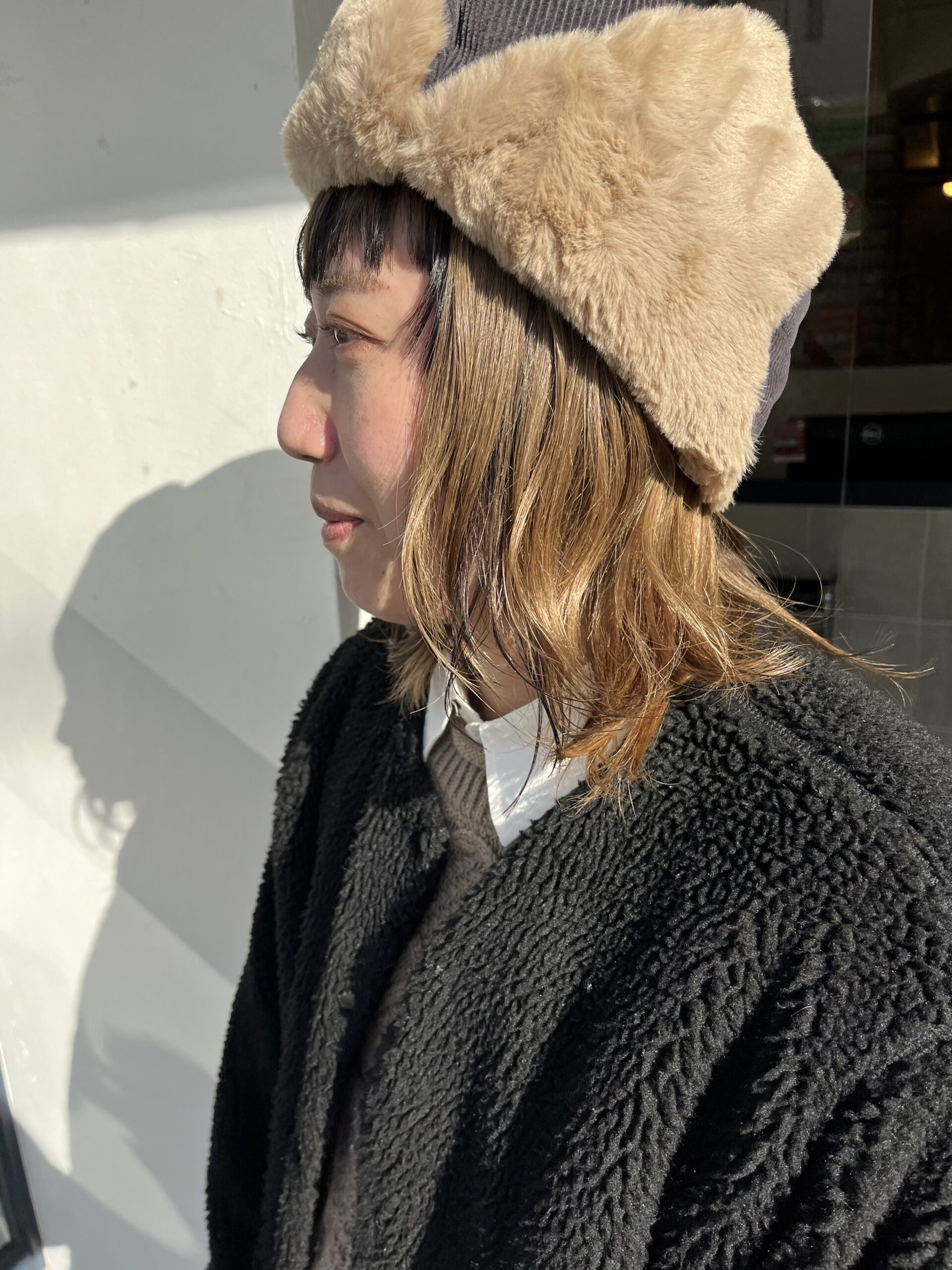 顔まわり(前髪+こめかみ付近)にローライトを入れたスタイル。