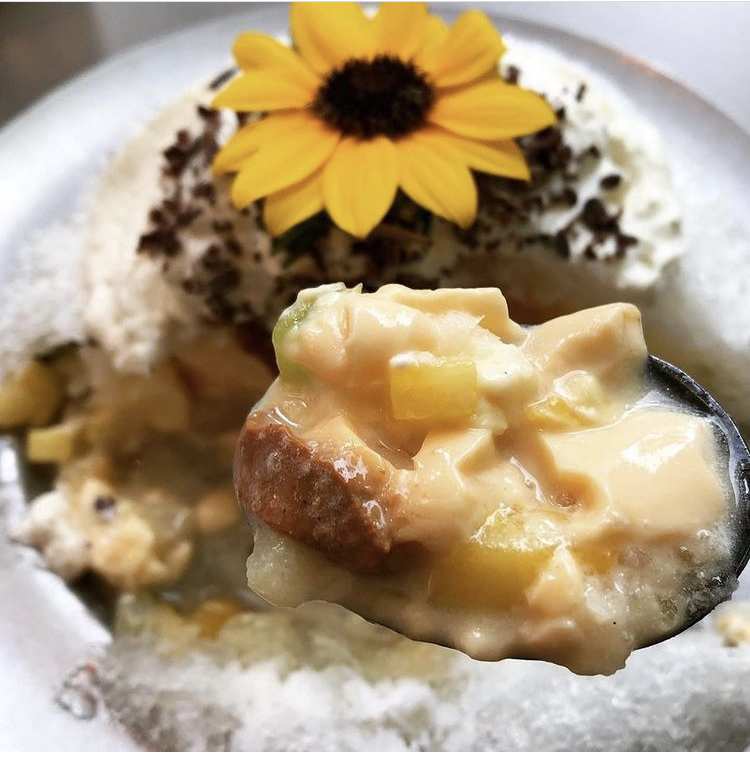 かき氷の中にプリンとフルーツが入った