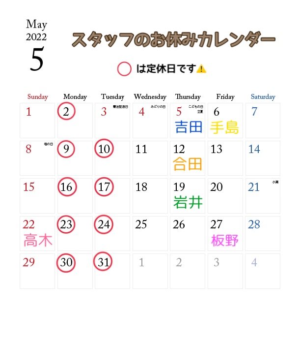 5月のお休みのお知らせ🎏