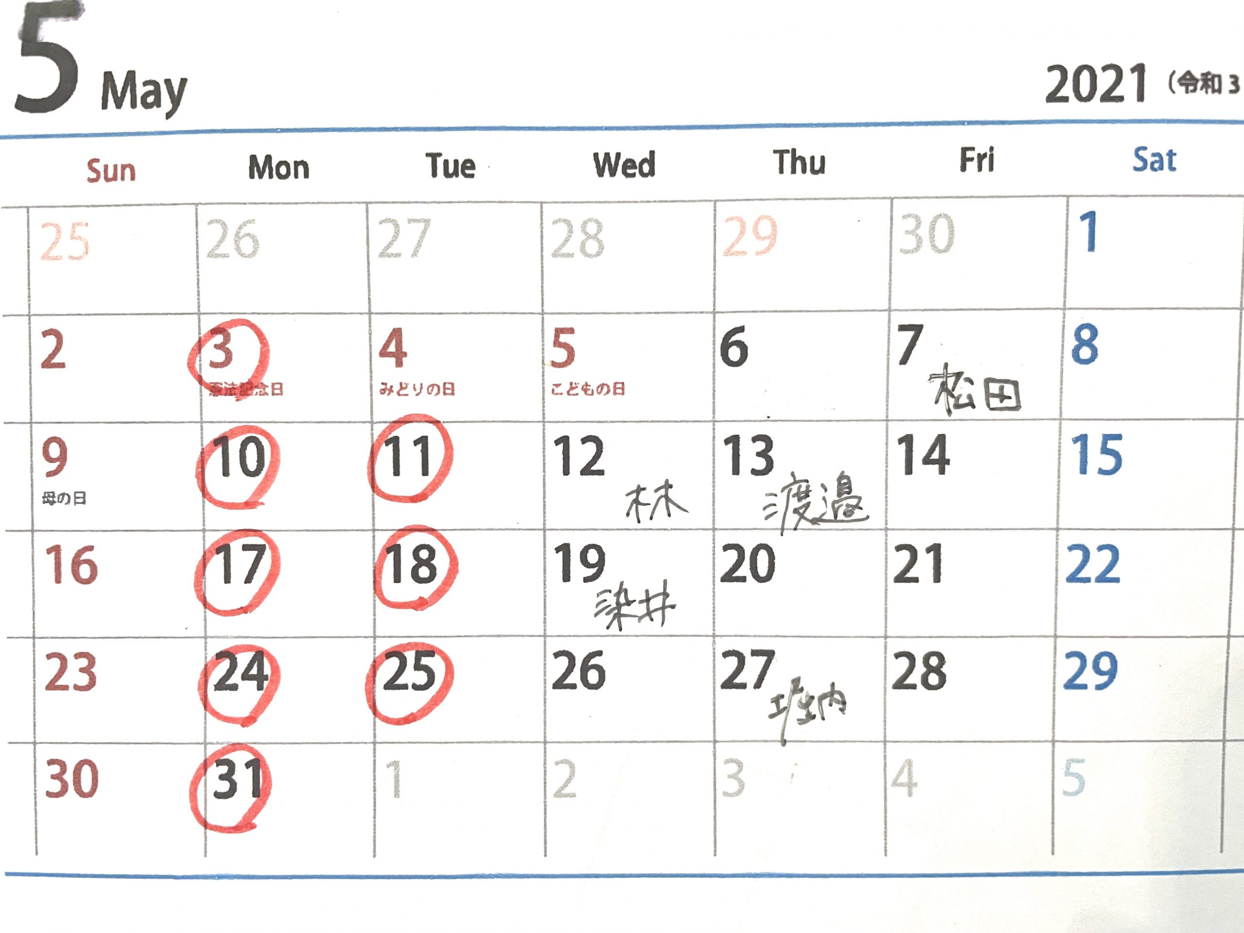 5月の個人休み(スタイリスト)の